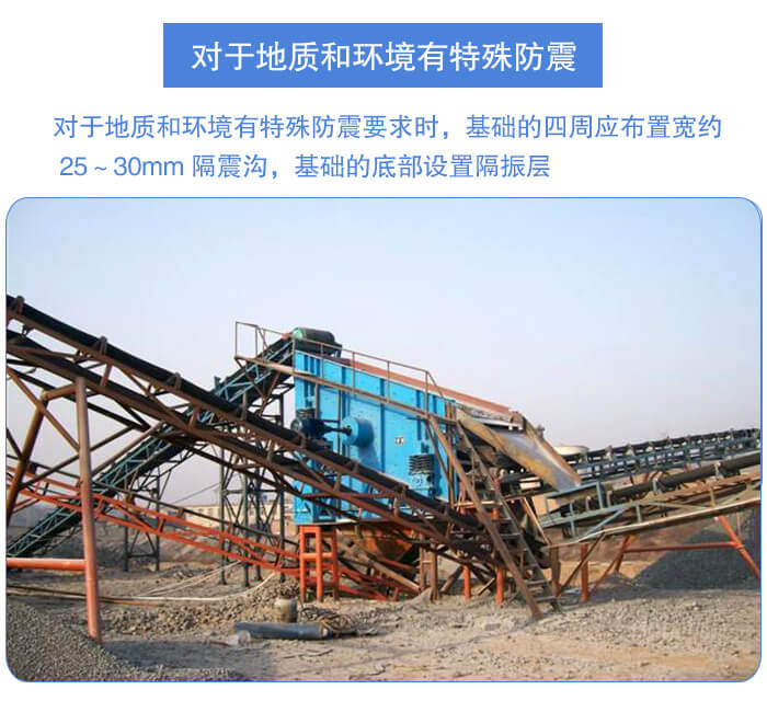 對(duì)于地質(zhì)和環(huán)境有特殊防震要求時(shí),基礎(chǔ)的四周應(yīng)布置寬約 25~30mm 隔震溝,基礎(chǔ)的底部設(shè)置隔振層,基礎(chǔ)底部夯實(shí)之后,用水泥、煤渣、瀝青鋪設(shè)厚度約 200mm,在此隔振層上再澆灌混凝土。