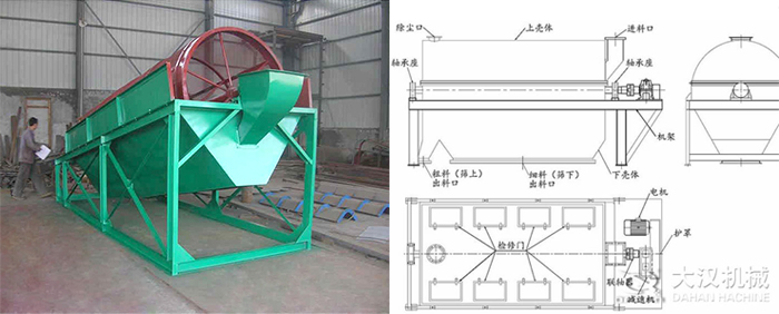 電機(jī)驅(qū)動(dòng)滾筒軸線作旋轉(zhuǎn)運(yùn)動(dòng),減速機(jī)調(diào)節(jié)筒體以一定的轉(zhuǎn)速旋轉(zhuǎn),物料由進(jìn)料口進(jìn)入筒體內(nèi),在旋轉(zhuǎn)產(chǎn)生的離心力作用下,物料在筒內(nèi)翻滾,自上而下通過(guò)分級(jí)篩網(wǎng)析出,由于篩網(wǎng)分級(jí)尺寸不同,物料逐漸被分離篩選,粒度合格的物料經(jīng)篩分后落入到各自的漏斗,然后由人力方式運(yùn)出或通過(guò)輸送機(jī)自流送往成品站。合格產(chǎn)品經(jīng)過(guò)下端出料口排出,顆粒較大,分選不合格的產(chǎn)品經(jīng)另一排料口排出,筒內(nèi)清理裝置,使篩網(wǎng)不宜被阻塞。