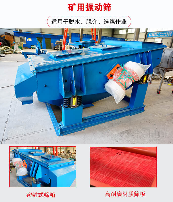 礦用振動(dòng)篩采用振動(dòng)電機(jī)做激振源、橡膠彈簧裝置支撐并隔振、高耐磨材質(zhì)篩板、密封式篩箱等