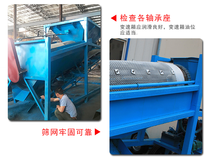 一、篩沙機調(diào)試、篩沙機各部件安裝完,檢查合格后,可進行試運轉(zhuǎn)。試運轉(zhuǎn)前,應(yīng)詳細檢查各部件按圖紙所示安裝正確,各緊固件牢靠,篩體周圍是否有妨礙滾筒篩篩沙機運行的障礙物;