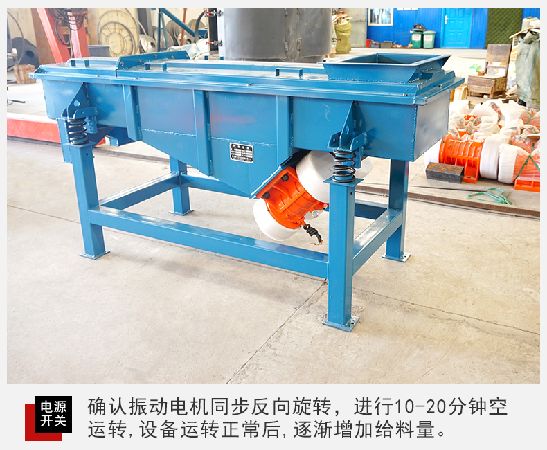 3、閉合電源開關(guān),確認(rèn)振動電機(jī)同步反向旋轉(zhuǎn),進(jìn)行10-20分鐘空運(yùn)轉(zhuǎn),設(shè)備在運(yùn)行時如有異常聲音,應(yīng)迅速關(guān)機(jī)進(jìn)行檢查處理。設(shè)備運(yùn)轉(zhuǎn)正常后,可將少量需篩分的物料通過進(jìn)料口設(shè)入篩機(jī)內(nèi),確認(rèn)物料向出料口方向行進(jìn),然后逐漸增加到所需和所能承受的給料量。