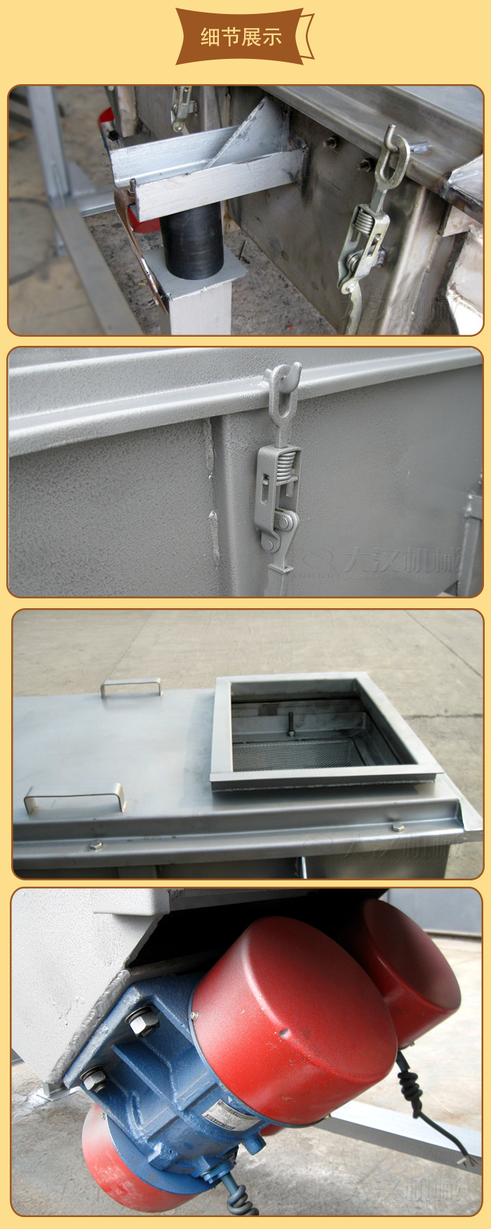 5、電機(jī)臺(tái)座:安裝振動(dòng)電機(jī),使用前連接螺釘必須擰緊,特別是新篩機(jī)試用前三天、必須反復(fù)緊固,以免松動(dòng)造成事故。
