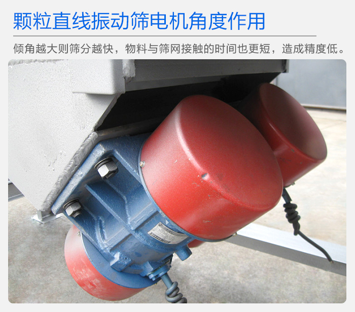 顆粒直線振動(dòng)篩電機(jī)的安裝角度是可以調(diào)整的,角度不一樣,其產(chǎn)生的振幅大小也不一樣,一定傾角的直線振動(dòng)篩,可以有效的提高篩分產(chǎn)量,增大生產(chǎn)效率,傾角越大,則篩分越快,物料與篩網(wǎng)接觸的時(shí)間也更短,則篩網(wǎng)使用年限也會(huì)增加,角度過(guò)大。則容易造成篩分精度達(dá)不到,影響篩分質(zhì)量,所以顆粒直線振動(dòng)篩的振動(dòng)電機(jī)在安裝時(shí),角度的選取很重要,客戶在開機(jī)使用直線振動(dòng)篩前,應(yīng)根據(jù)生產(chǎn)需求,調(diào)整好角度,一般直線振動(dòng)篩廠家在篩機(jī)出廠前,將其角度調(diào)整為45度。